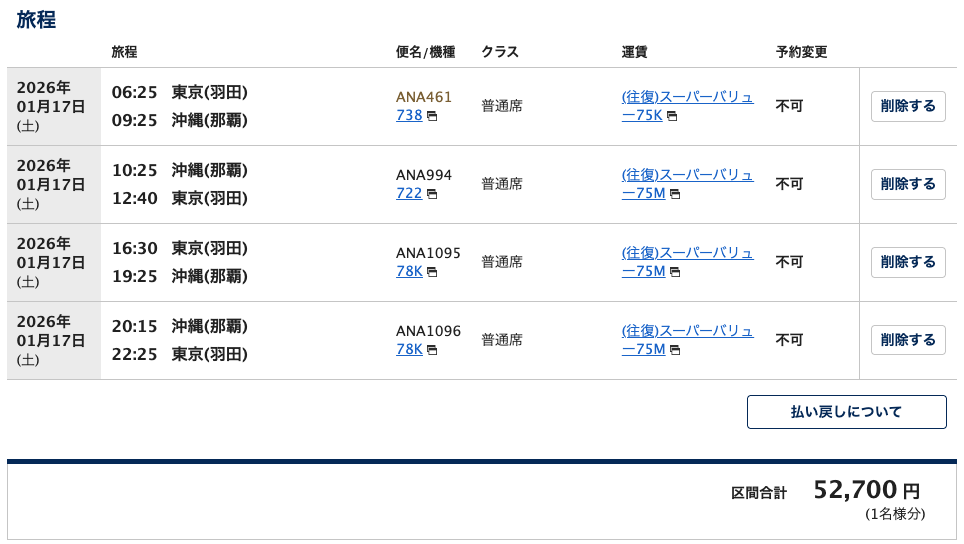 2026年の国内線でのSFC修行は今まで以上に高額(44.2万円以上)となり、価格を抑える上では羽田ー那覇間が重要となります。往復スーパーバリューを利用し長距離区間を数往復することで効率よく貯められます。(最安値)