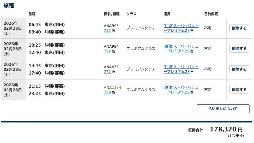 お金に余裕があり優雅にSFC修行を行いたい方は羽田ー那覇線のプレミアムクラスがおすすめです。沖縄の冬はオフシーズンのため4.4万円から航空券を購入可能です。(8月のお盆休みは8.2万円〜)