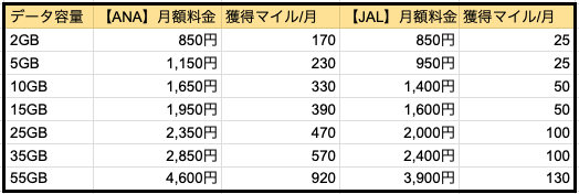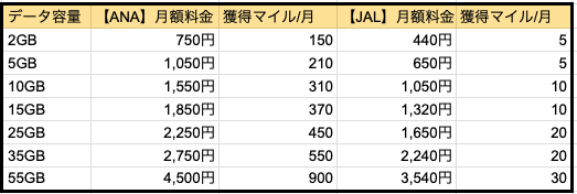 ANAモバイル・JALモバイルプランの比較表