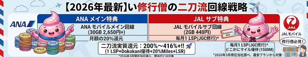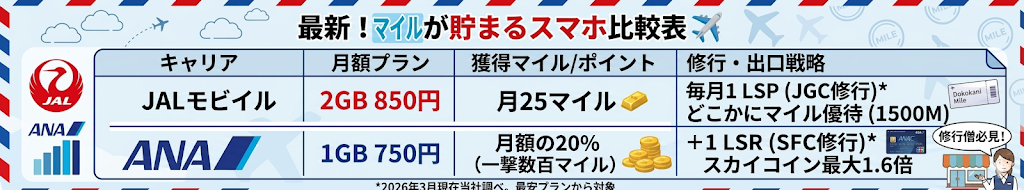 私は現在SFC修行(2027年予定)とJGC修行(長期的)を行っているため、少しでもマイルを貯め、修行に活用しようと思っています。両者が提供するモバイルサービスは、飛行機に搭乗するよりも、効率的にマイルやSPが貯められるため、非常に使いやすいサービスとなっています。両者のいいとこ取りをすることで、修行をしていない方にも多くのベネフィットがあり、格安に旅行を楽しむことができます。