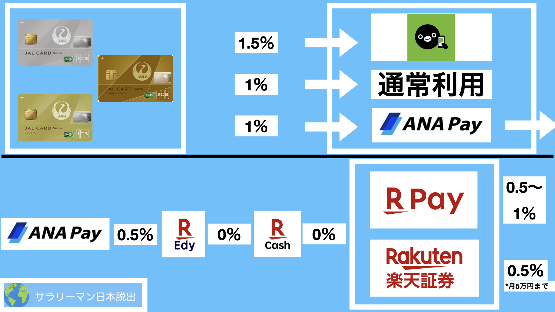 - 二重取りの最大化: JALカードSuicaの決済分(1%)に加え、チャージしたANA Pay(0.5%)楽天Payでの支払い(1.5%)で楽天ポイントもガッツリ獲得!(合計3%)